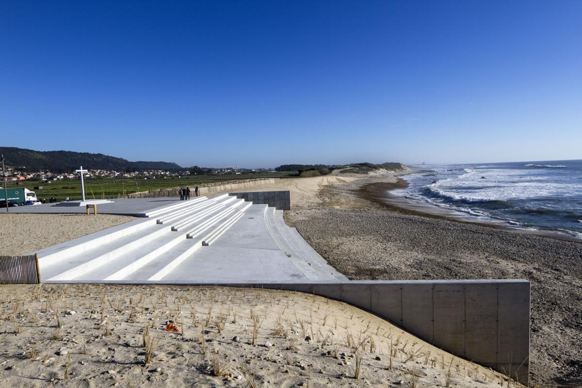 O chão que pisamos, no terreiro dominado pelo grande cruzeiro, tem, além de cubo de granito, linhas feitas de pedra mais clara deixadas como memória dos espaços que até ao ano passado foram ocupados pelas casas. Um sinal dos 30 metros de recuo, que permitiram, nas zonas laterais deste escadório de betão, a colocação de paliçadas para regeneração do cordão dunar. Tudo junto, entre fundos comunitários e esforço municipal, a obra custou 1,7 milhões de euros.